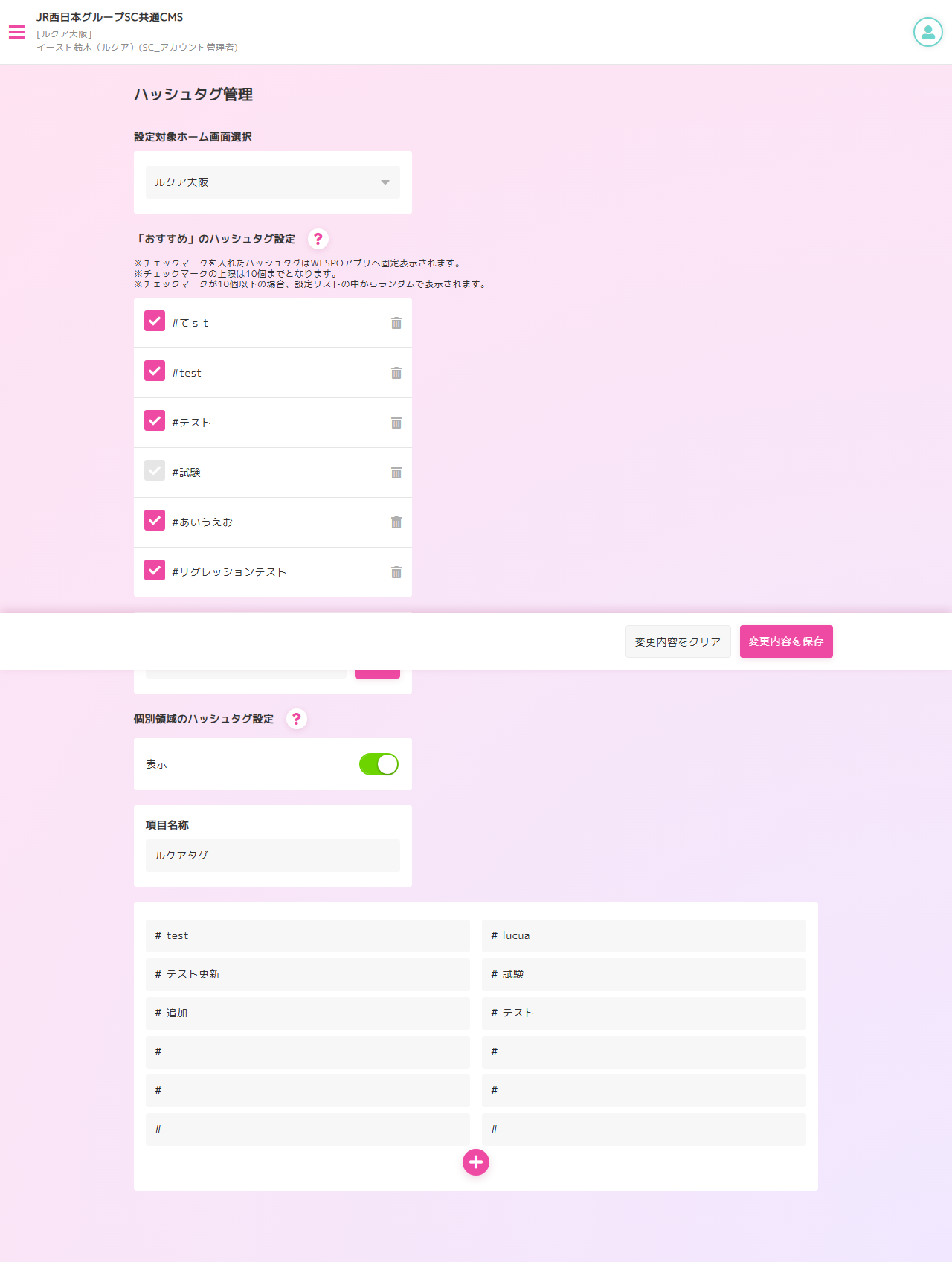 WESPOアプリのトピックス画面に表示される「おすすめ」ハッシュタグと、各SC独自のハッシュタグの登録・編集・削除ができます。