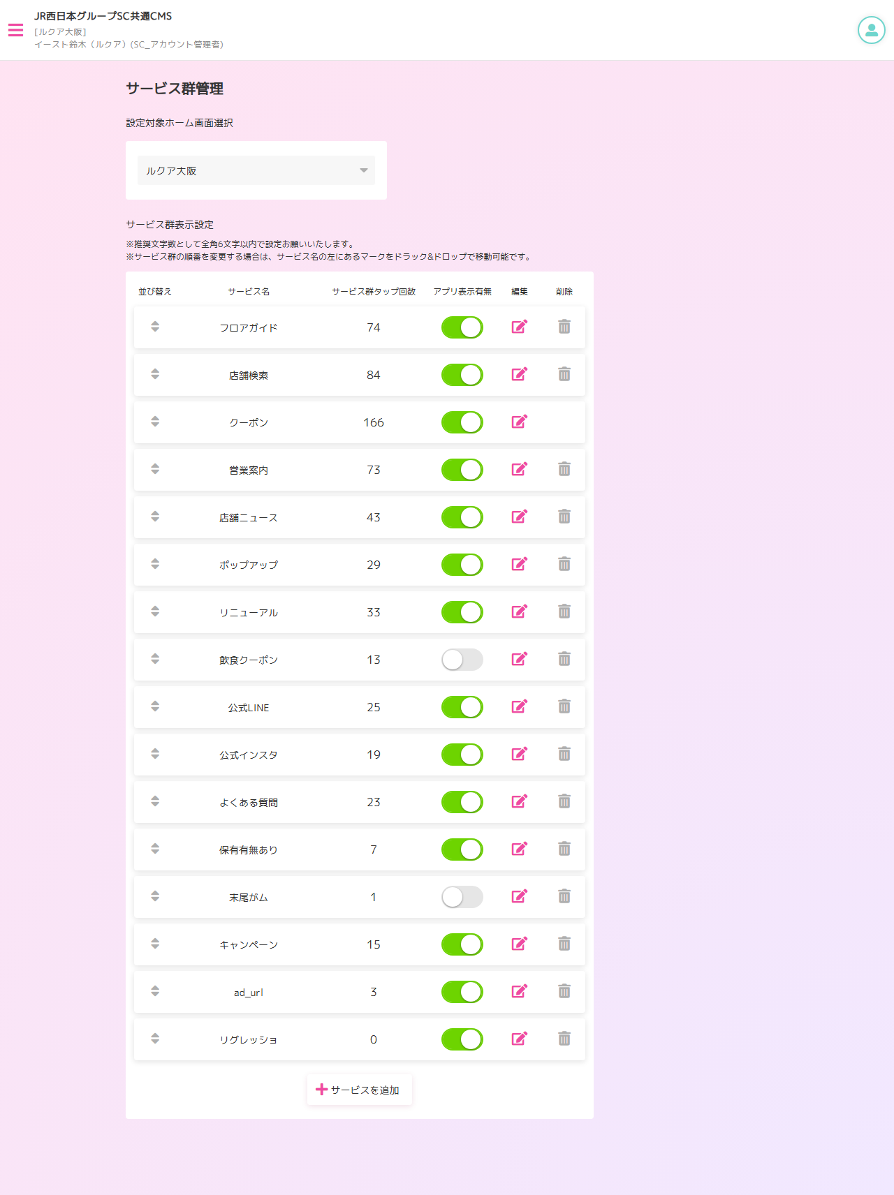 WESPOアプリのホーム画面に表示される「サービス群」(フロアガイド・店舗検索・クーポン等のショートカットアイコン)の追加・編集・削除・表示順の管理ができます。